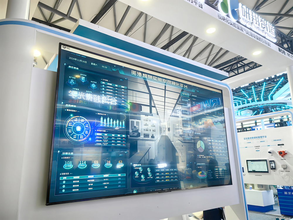 展位中央大屏实时动态演示八大管理平台运作,全方位展现平台助力实验室高效管理的强大作用。