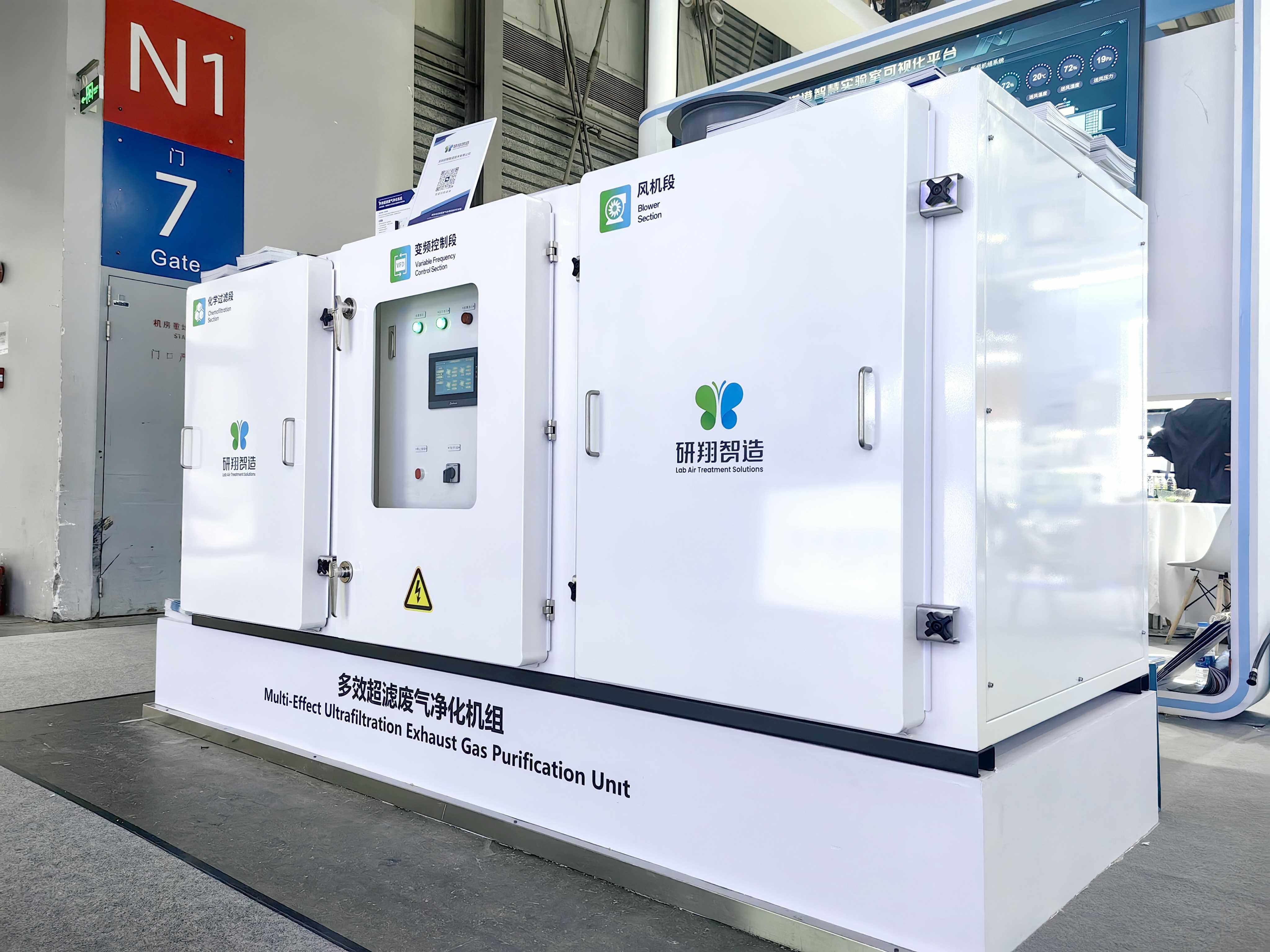 此次展会展示了废气处理设备,其中包含了化学过滤段、变频控制段及风机段。其精巧简约的外观吸引了参观者的目光,模块化设计,便于设备扩展,按照废气处理需求自由组合功能段,提供定制化的解决方案,使产品灵活性和匹配性大大提升。
